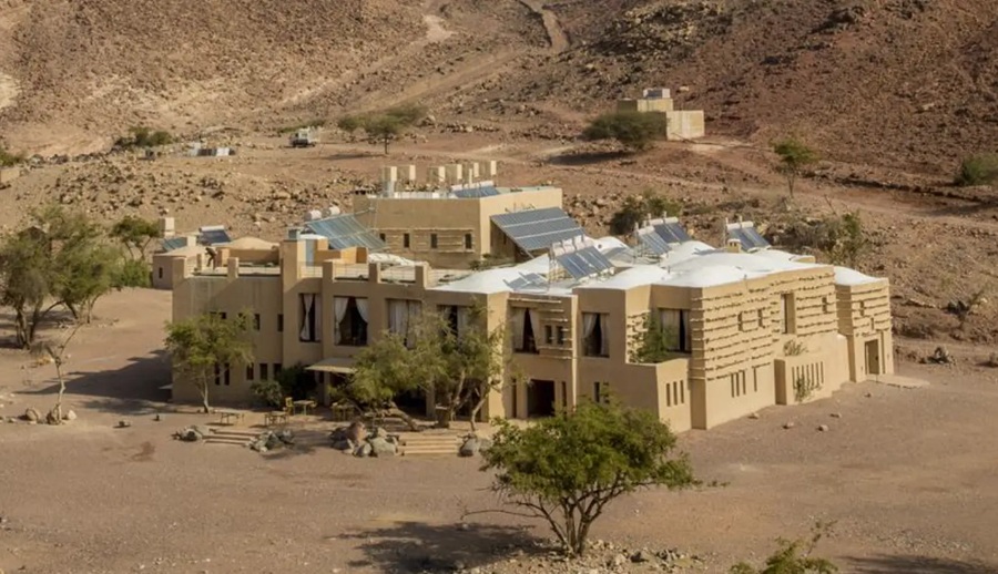 Feynan Ecolodge, en Dana Biosphere Reserve, Jordania, es un lodge solar con 30 habitaciones en un desierto que usa paneles para energía renovable, integrando beduinos en conservación de cabras salvajes.