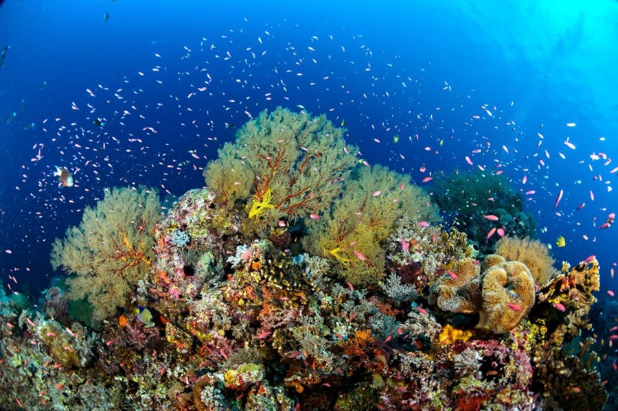 Great Chagos Archipelago, en el Océano Índico, es el atolón coralino más grande del mundo, con 55 islas y corales que cubren la mitad de las especies globales, incluyendo el Ctenella chagius en tonos iridiscentes.